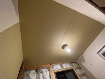 二階に立ち上がる水道管からの漏水で洗面室の天井や壁が水に濡れてしまい
